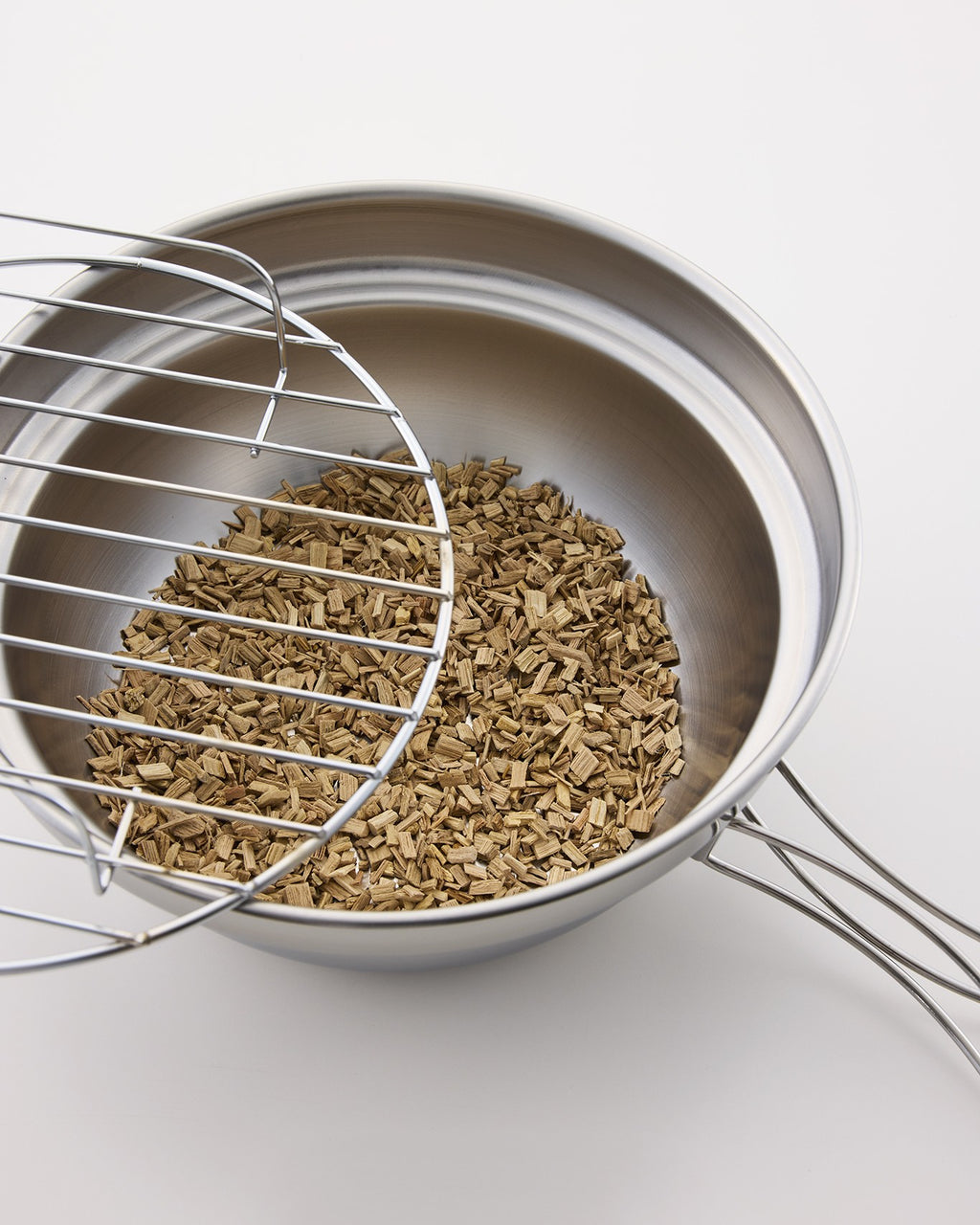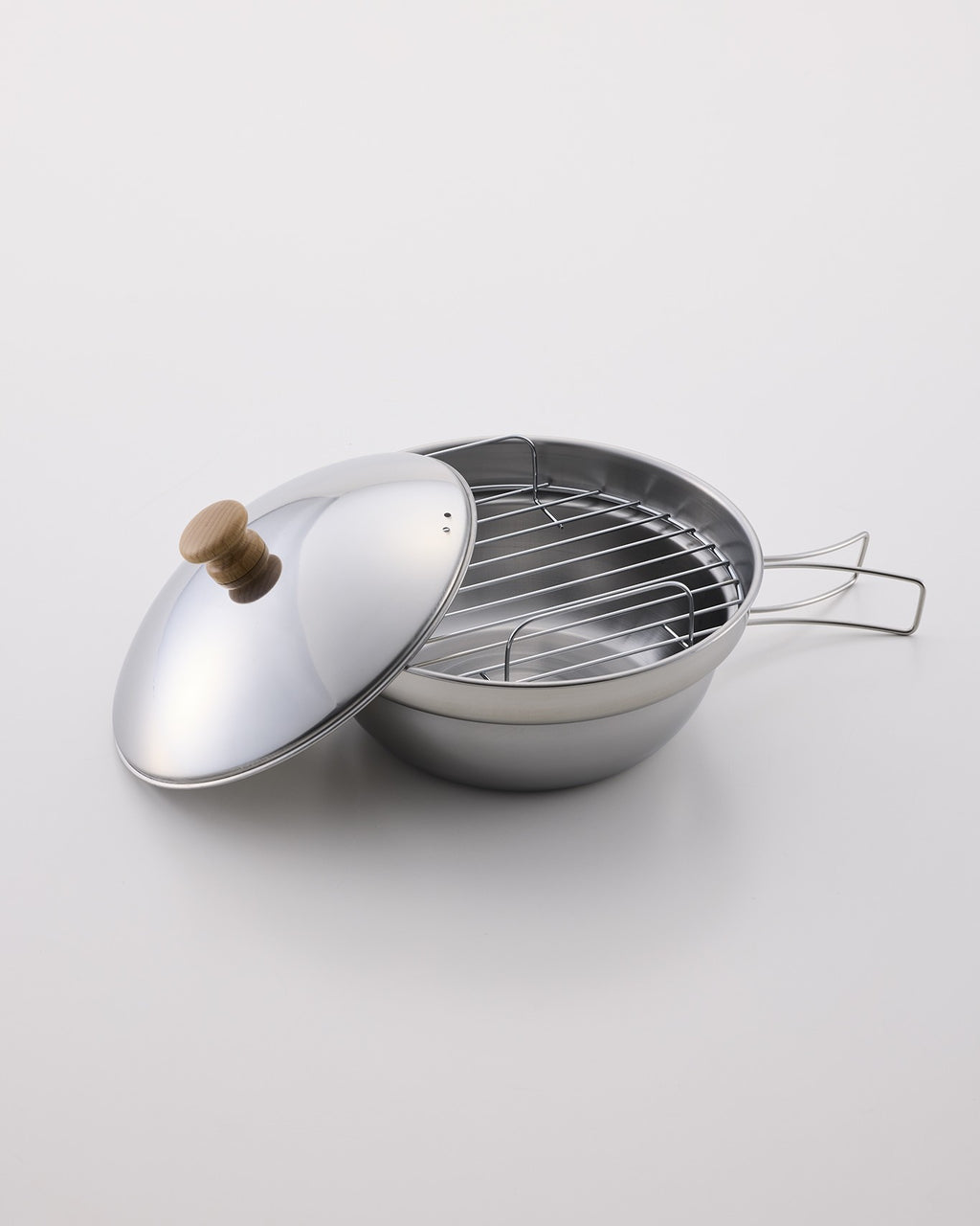 鍋・フタ・ハンドル:ステンレス、燻煙網:鉄(クロームメッキ)、ツマミ:天然木