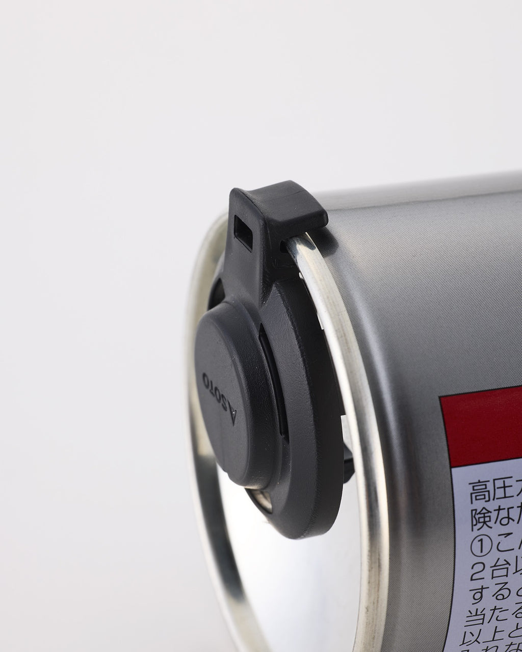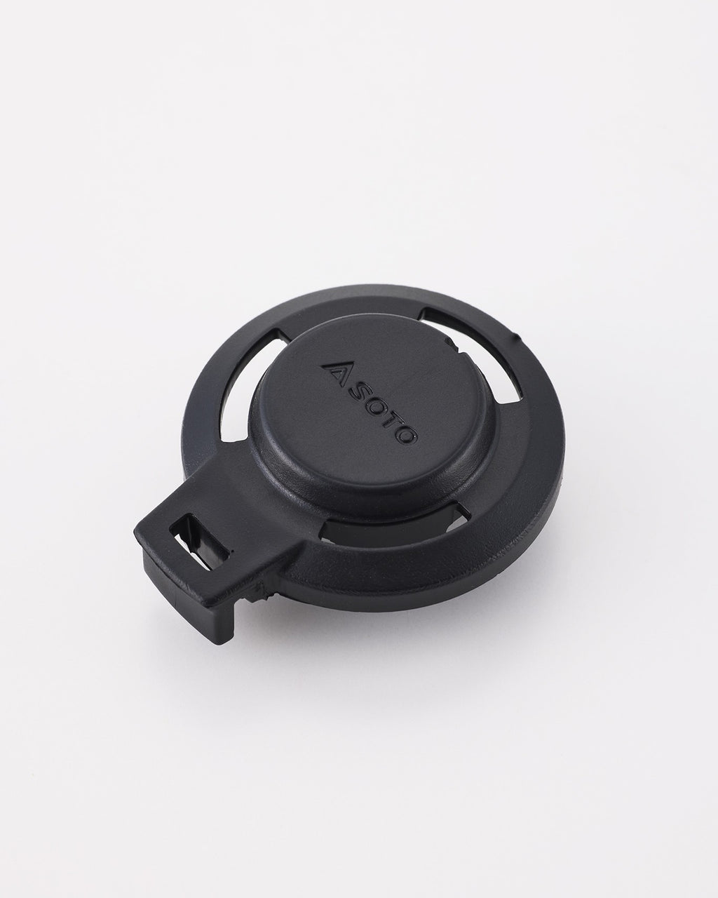 フラット形状でコンパクト、パッキング時に外れにくく、ボンベ使用時は底面に取付可能でキャップの紛失を防ぎます。